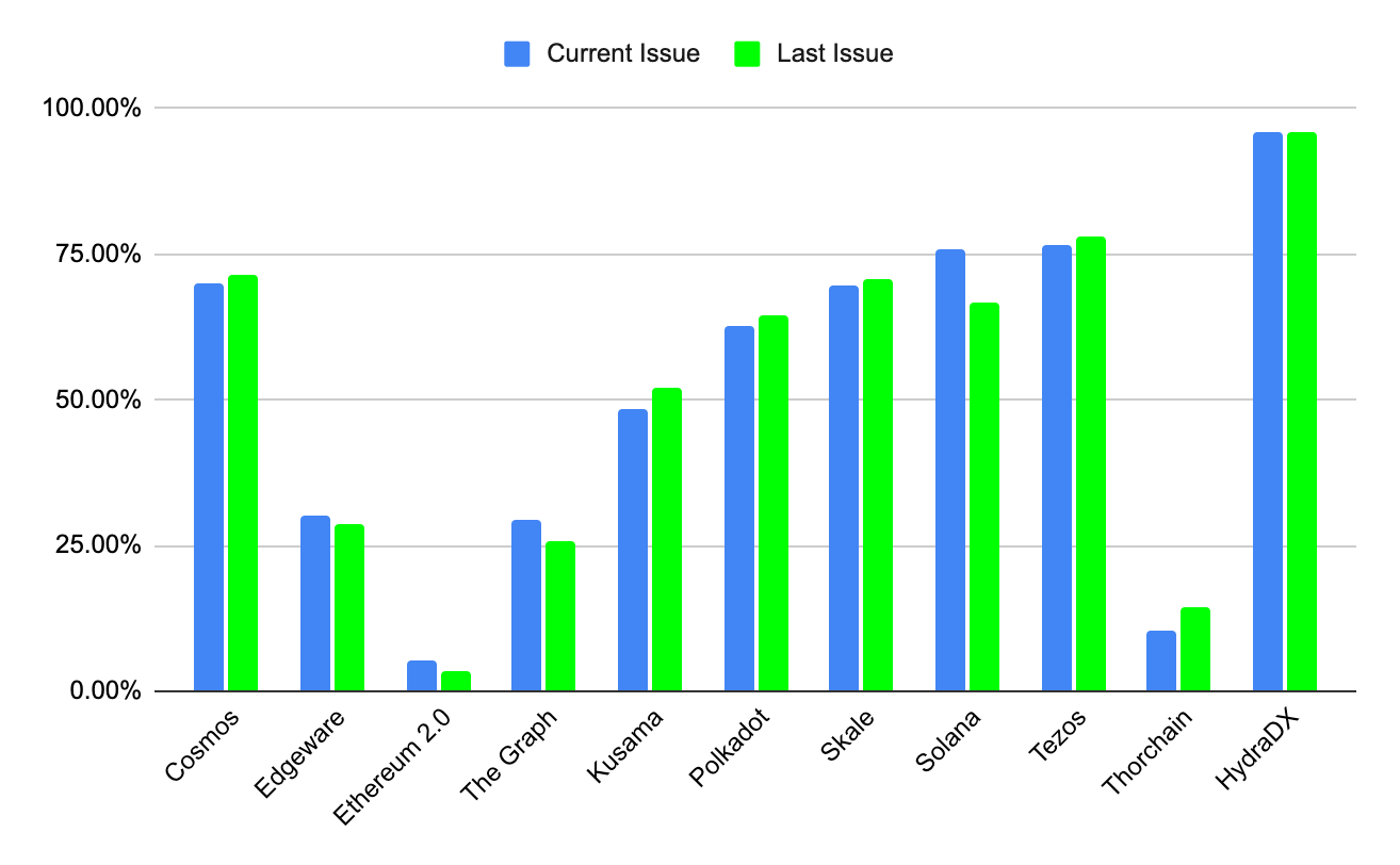 Across the board, the share of staked tokens (in % of the Circulating Supply) across the whole network for each of our portfolio projects remains largely unchanged. Notable outliers are Solana with almost 10% more SOL that is being staked compared to last month. The Graph, Ethereum, and Edgeware can each record a ~2% increase in native assets being staked on their network. For Cosmos and Polkadot we can see a slight decrease of ~2% whereas, for Kusama, we can see a decrease of ~3.5% in native assets that are staked across the whole network. Thorchain saw the highest decrease with about 4% less RUNE being staked compared to four weeks ago.