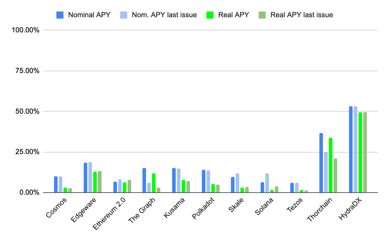 This chart compares the Nominal & Real APYs across our portfolio networks as well as how these figures have changed since the last issue. For most of the networks, we provide you with a precise reward calculator, which you find on the subpage of the respective network on our homepage. Please note that the calculator is not available on mobile devices.